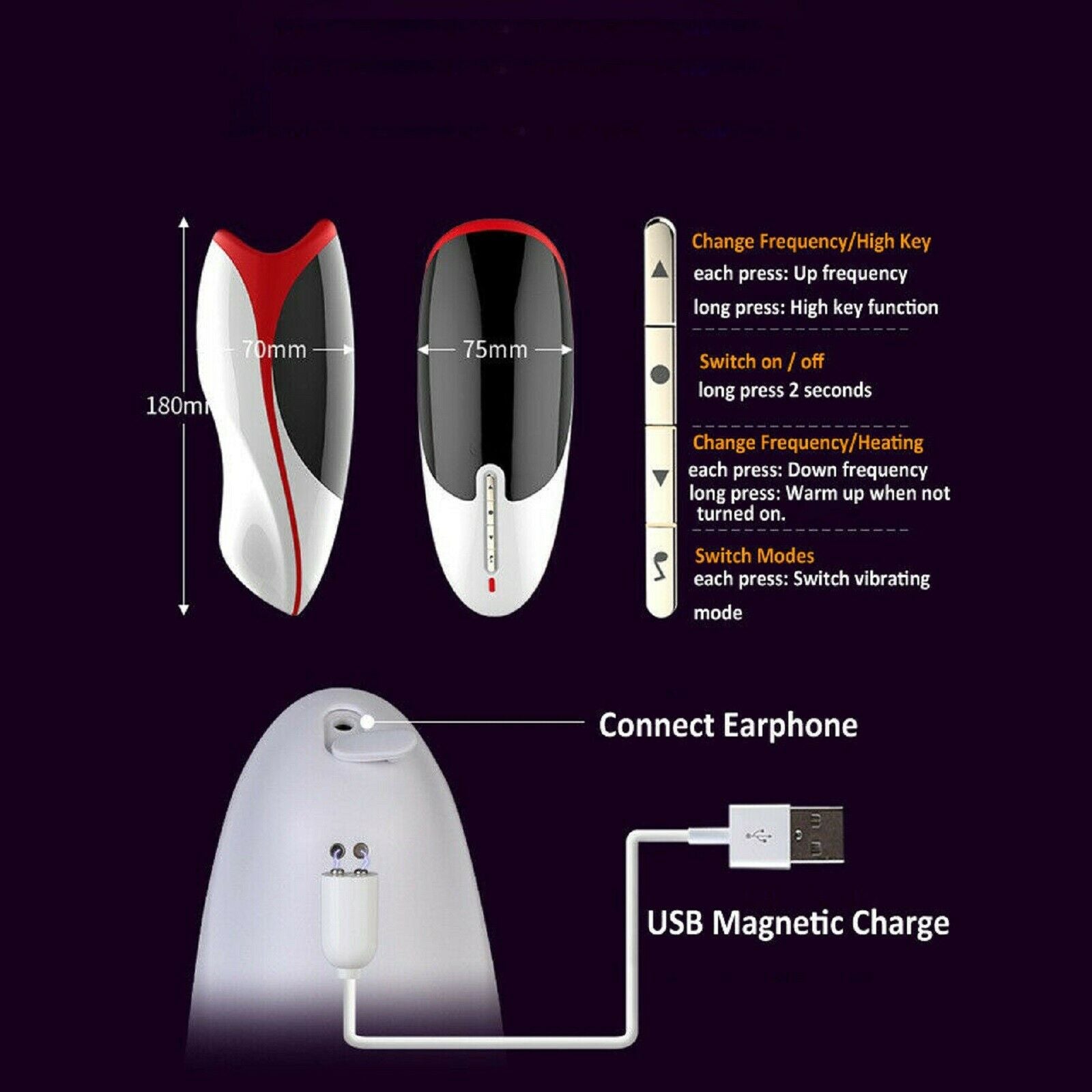 Rechargeable warming male masturbator that mimics oral sex stimulation on the head and frenulum.